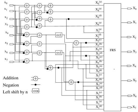 In this architecture [1], AI encoding is applied to the outlined section in Figure 1 using a bivariate polynomial of the form , with a selection of and in order to guarantee error free encoding. The use of and provides the most efficient encoding [1]. Using this scheme, the four multipliers, , involved in the Arai DCT algorithm can be represented in the form , where superscripts (a), (b), (c) and (d) are related to elements 1, , and , respectively. Table 1 brings the encoding of these multipliers (multiplied by a factor of 4) [1]. As shown in the signal flow graph in Figure 2, the outlined area in Figure 1 is implemented using two adders and the final reconstruction step (FRS) [1]. The FRS performs the mapping of the computed transform coefficients from infinite precision AI encoding into fixed point representation at any desired precision [1].