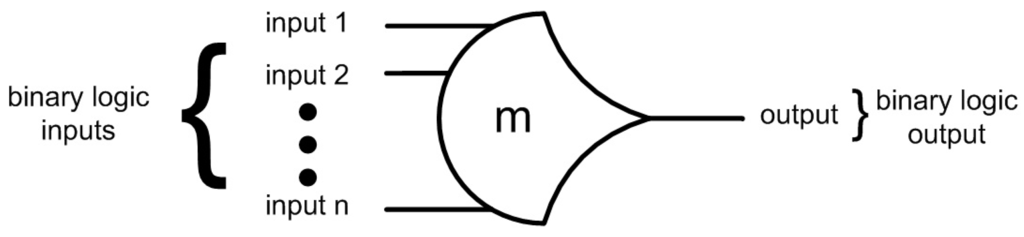 NCL utilizes threshold gates with hysteresis for its basic logic elements [9]. The primary type of NCL gate is the THmn threshold gate, where 1 ≤ m ≤ n, as depicted in Figure 2. THmn gates have n inputs and a threshold value of m. At least m of the n inputs must be asserted before the output will become asserted. Because NCL gates are designed with hysteresis, all inputs must be de-asserted before the output will be de-asserted. This ensures a complete transition of inputs back to NULL before asserting the output associated with the next wavefront of input DATA. Therefore, a THnn gate is equivalent to an n-input C-element, and a TH1n gate is equivalent to an n-input OR gate. In the representation of a THmn gate, each of the n inputs is connected to the rounded portion of the gate; the output emanates from the pointed end of the gate; and the gate’s threshold value, m, is written inside of the gate.