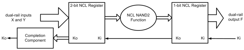 The Completion Component is a TH22 gate used to combine the two Ko signals from the input registers to create a single Ko handshake output for the system. The internal design of NCL gates at the transistor-level, as well as the gate-level design of NCL components, such as an NCL Register, Completion Component, and NAND2 function, are detailed in [8].