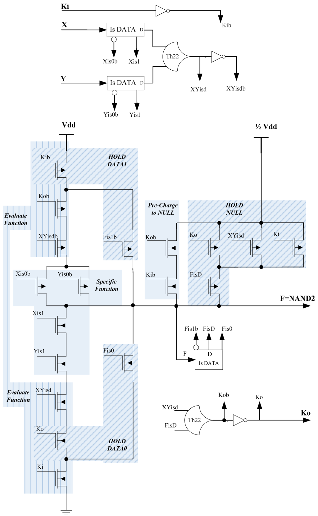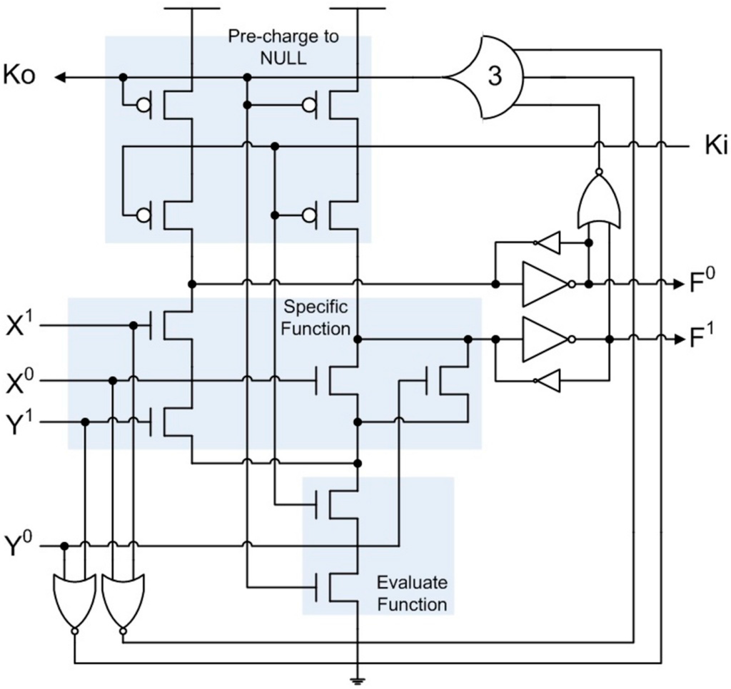 The dual-rail output is initially pre-charged to NULL. When Ki and Ko are rfd, the specific function will evaluate when the inputs, X and/or Y, become DATA, causing the output, F, to become DATA. Ko will then transition to rfn only after all inputs and the output are DATA. When Ki is rfn and Ko is rfd, or vice versa, the output will be floating, so weak inverters must be used to hold the current output value. After both Ki and Ko are rfn, the output will be pre-charged back to NULL. After all inputs become NULL and the output changes to NULL, Ko will change back to rfd, and the next DATA wavefront can evaluate after Ki becomes rfd. PCHB circuits contain Boolean NOR2 gates, strong-weak inverter pairs, and a Th33 gate, which ensures that all data inputs and outputs are in the same state (either DATA or NULL) before toggling the Ko signal to request the next DATA or NULL wavefront.