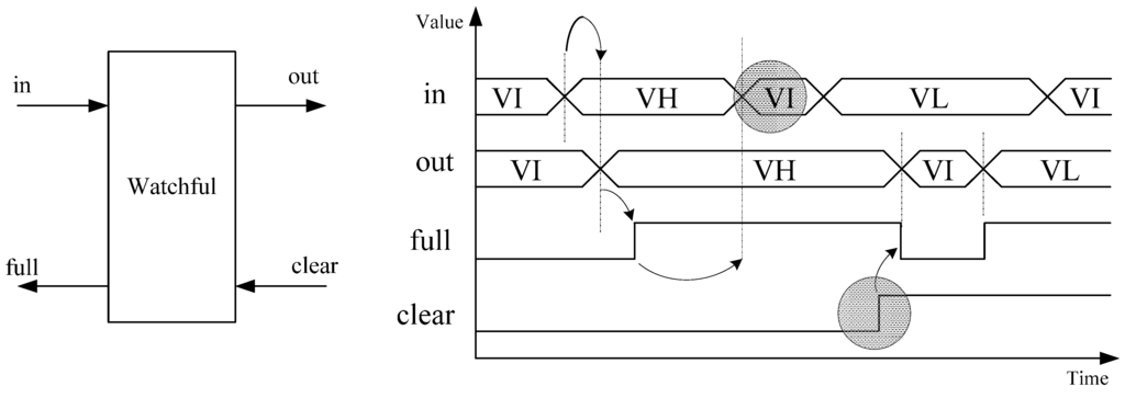 References [10,11] develop a ternary logic completion detection circuit for use with a bounded-delay self-timed paradigm; and references [12,13] develop a ternary bounded-delay self-timed paradigm, which is similar to micropipelines [4]. However, as mentioned in the introduction, delay-insensitive paradigms have many more advantages compared to their bounded-delay counterparts. Reference [14] develops a delay-insensitive ternary logic transmission system, called Asynchronous Ternary Logic Signaling (ATLS), which converts dual-rail signals into ternary logic for transmission over a bus, in order to decrease transmission area and power. However, all of the logic processing is still done using dual-rail logic. References [15,16] develop a circuit called a Watchful as part of their proposed delay-insensitive ternary logic paradigm. However, their approach is not delay-insensitive because it assumes that the input, in, will transition to VI (NULL) before the input, clear, is asserted, causing the output, full, to be de-asserted, shown by two shaded circles in the adapted timing diagram in Figure 5.