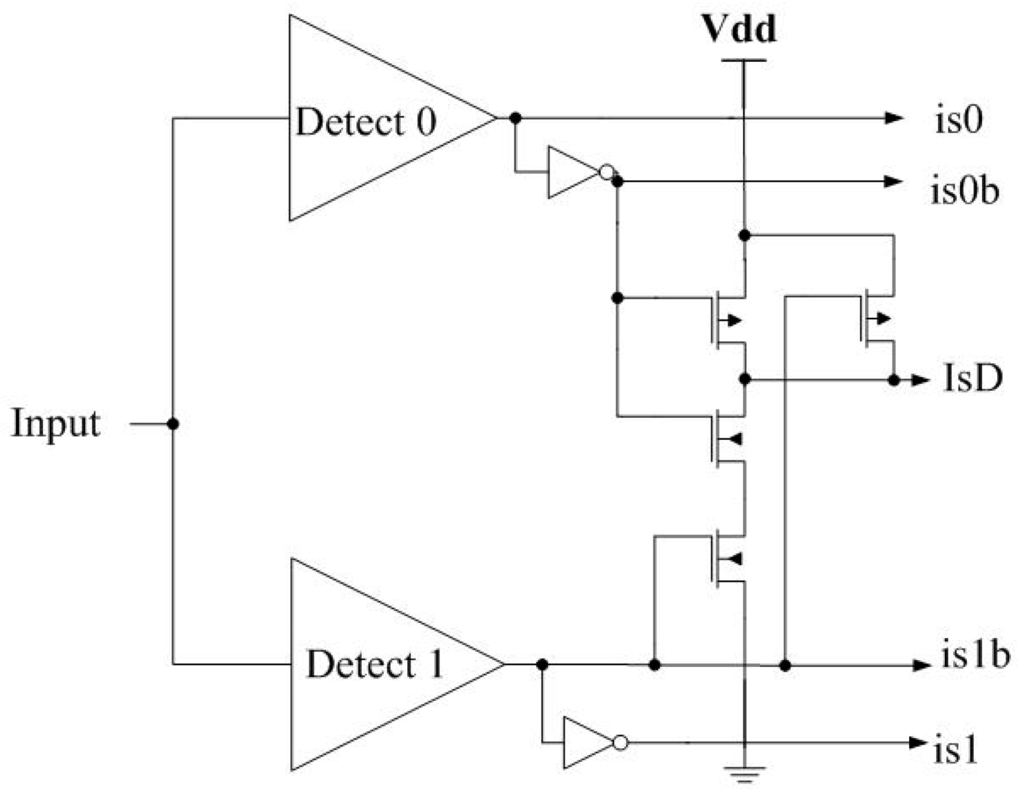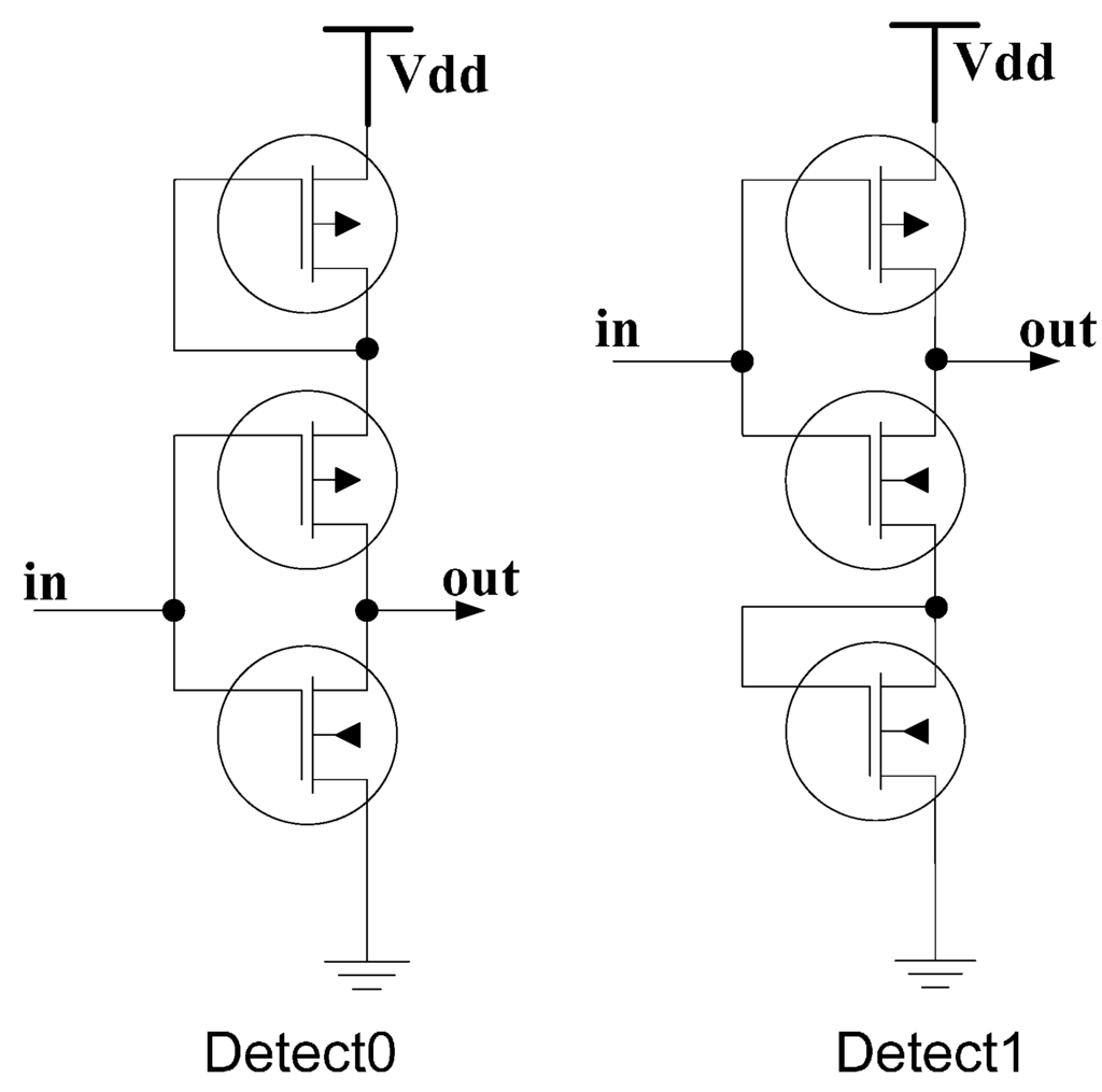 Reference [17] utilizes diode-connected transistors to shift the threshold voltage in special inverters dedicated to detect the presence of only one input logic level. As shown in Figure 6, for the Detect0 circuit, in, must be lower than Vdd-2VtP for the PMOS transistors to turn ON and pull out to Vdd. Similarly, for the Detect1 circuit, in, must be higher than 2VtN for out to be pulled down to Gnd. The truth table for Detect0 and Detect1 is provided in Table 1.