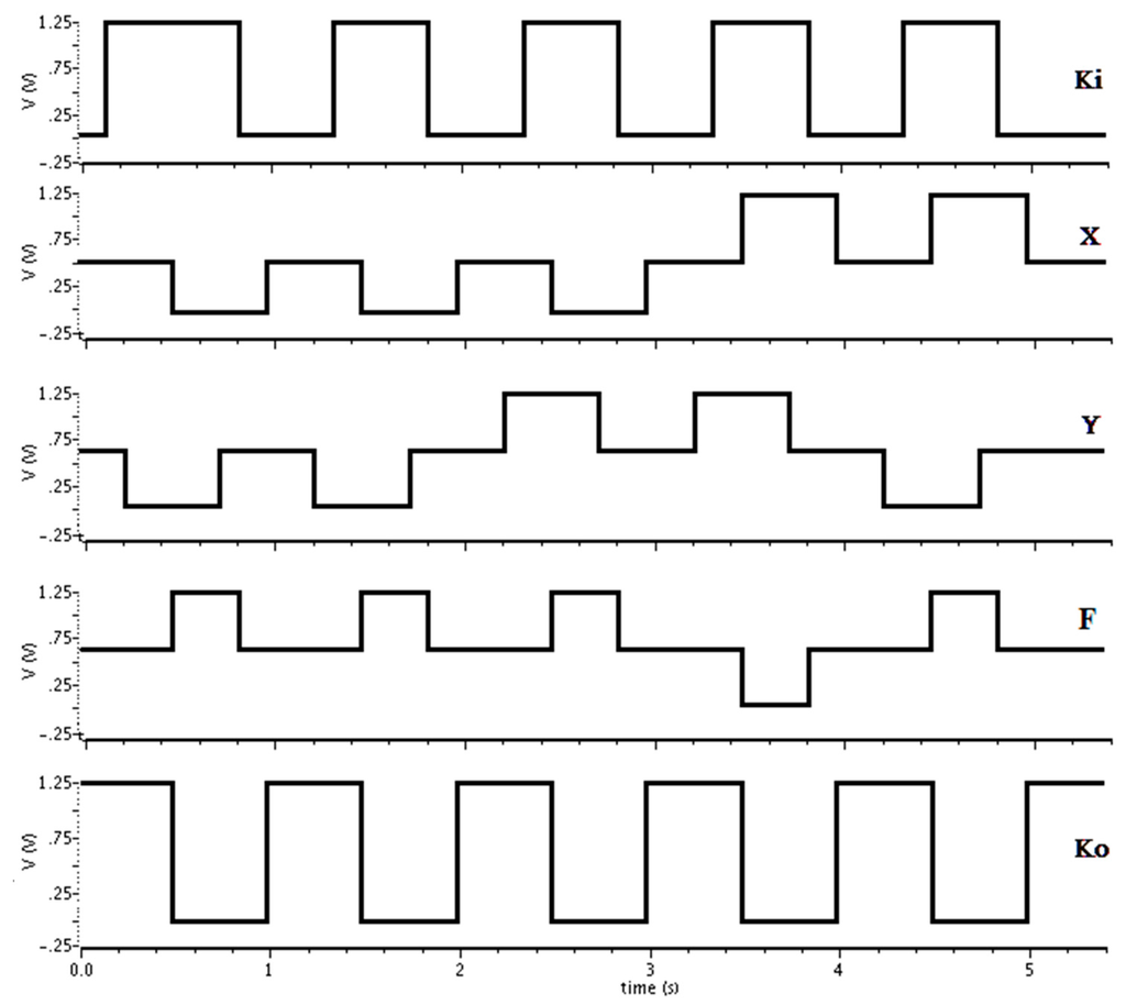 Like PCHB, DITL circuits are designed at the transistor-level, with registration included in every combinational logic component; the major difference is that DITL uses ternary data inputs and outputs, while PCHB utilizes binary dual-rail inputs and outputs. Two different versions of the DITL architecture are presented herein. For DITL Version I, shown in Figure 9, data inputs X and Y are directly connected to the Is-DATA components as well as the Specific Function. When Ki and Ko are both rfd and the inputs, X and Y, are both DATA, the specific function will evaluate, causing the output, F, to become DATA, which will then transition Ko to rfn. When Ko is rfn and Ki is still rfd, the specific function is floating, so the output needs to be held at its proper DATA value, either DATA0 or DATA1, which is done through the Hold 0 and Hold 1 circuitry, respectively. After Ki changes to rfn, the output will be pre-charged to NULL (i.e., ½ Vdd), through NFETs for increased speed. After all inputs become NULL and the output changes to NULL, Ko will change back to rfd, and the next DATA wavefront can evaluate after Ki becomes rfd and the inputs change to DATA. If Ki changes to rfd before the inputs become NULL, if the inputs become NULL before Ki changes to rfd, or if both Ki and Ko are rfd but the inputs are still NULL, the pre-charge to NULL logic will no longer be conducting, so the NULL output must be maintained through the Hold NULL circuitry. Figure 10 shows the Cadence simulation of the DITL NAND2 circuit, using the same IBM process. As can be seen from the waveforms, output F transitions to DATA only when both Ki (Lack) and Ko (Rack) are rfd and both inputs, X and Y, are DATA. F can transition back to NULL as soon as both Ko and Ki are rfn.