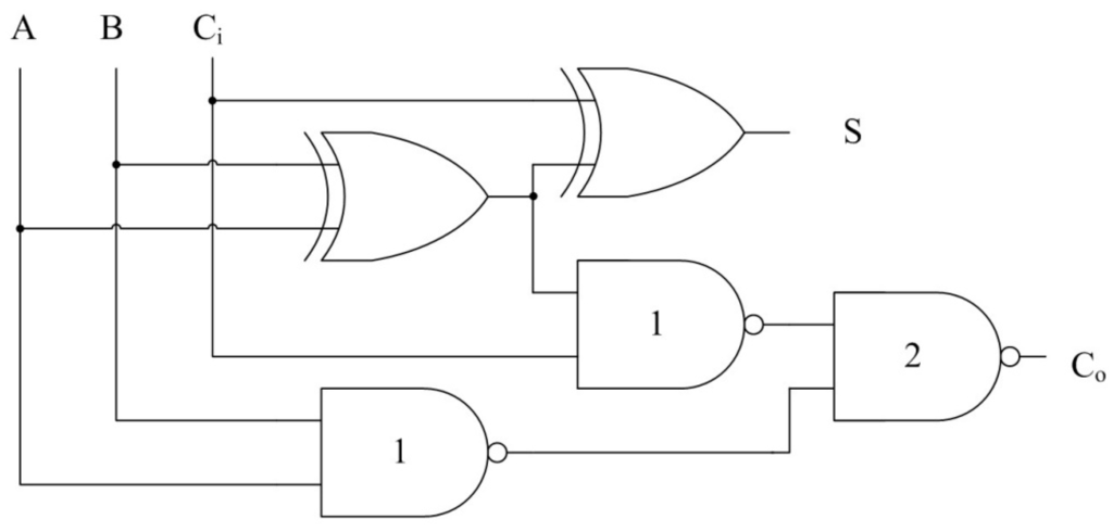 Since DITL circuits only have a single output wire per bit, timing, power, and EM can be more easily balanced because each signal will only drive a single capacitance, as in the case of the DITL Version II architecture discussed earlier (Figure 11); and a gate’s output will always make a ½ Vdd transition every DATA and NULL cycle, regardless of the DATA value (i.e., ½ Vdd → Vdd → ½ Vdd for a N→D1→N transition and ½ Vdd → 0 → ½ Vdd for a N→D0→N transition). Since each DITL Version II gate input always drives exactly one Is-DATA component, the type of gate being driven will not affect the load capacitance, such that the output driving strength selection of a DITL gate only depends on the number of gates it drives, which substantially reduces the number of balanced gates needed for a chip design library. As proof of concept, a series of Full Adders (FAs) was designed in Boolean, NCL, and DITL, using the same IBM process. The Boolean FA is a standard gate-level design consisting of five logic gates, as shown in Figure 12.