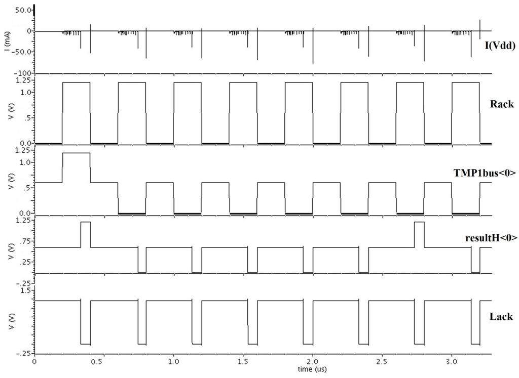 Most DI paradigms [5,157,158,159,160,161,162] utilize multi-rail signals, such as dual-rail logic, to achieve delay-insensitivity. For DI methods, separating two adjacent DATA wavefronts by a NULL wavefront [163] guarantees that there are always two switching events for each dual-rail signal for every DATA processed, thereby decoupling the total number of switching events from the data being processed. However, as pointed out in reference [164], the imbalanced load between the two rails still causes considerable power/timing/EM fluctuations among different data patterns.