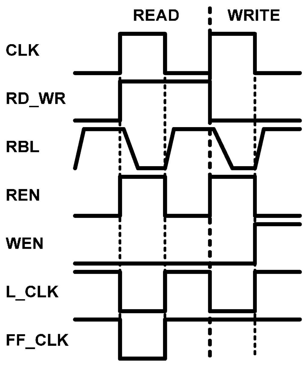 Figure 5 shows the timing diagram of a read operation followed by a write operation, assuming the array is in the active mode. RBLs are pre-charged during the low phase of the clock (CLK). If the RD_WR signal is high at the rising edge of CLK, REN is driven high to start the read operation. The latch clock signal—L_CLK—is held low until the end of the read operation (signaled by REN going low) where it is toggled high to enable the data latches to save. Based on the column address, one of the eight tristate buffers in the DMU is enabled and passes the data to the rising edge-triggered output registers controlled by FF_CLK. FF_CLK is driven low at the start of the read operation (REN = 1) and high at the end (REN = 0). When the RD_WR signal is low at the rising CLK edge, a write operation is performed. The write operation starts with a read on the low CLK phase (REN = 1 and L_CLK = 0). FF_CLK is not toggled since this data does not need to appear at the output. Once the row data is available (falling CLK edge), the multiplexers in the DMU choose between the latch data and the input data (DIN<15:0>) based on the column address, and then feed the result (D<127:0>) into the column drivers. Next, the WEN signal is asserted, to enable WWL and drive BL/BL to complete the write operation.