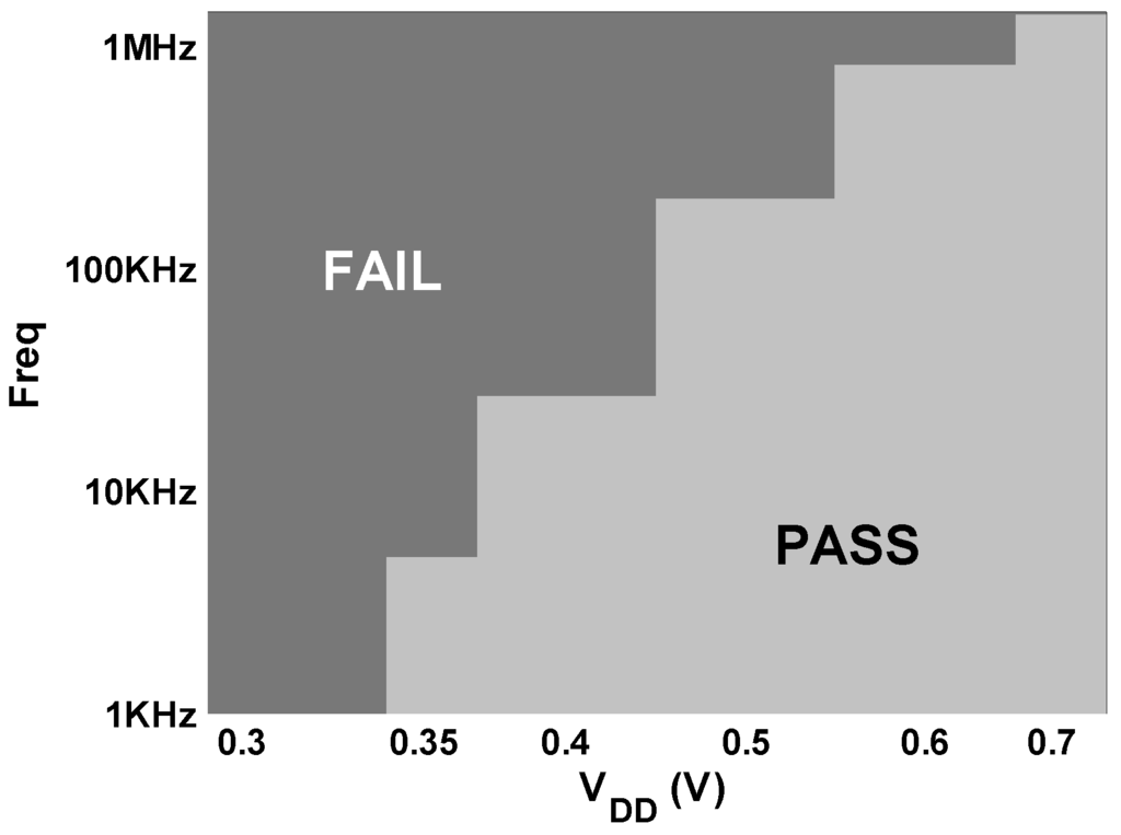 Figure 7. Measured shmoo plot of the ultra-low power (ULP) SRAM.