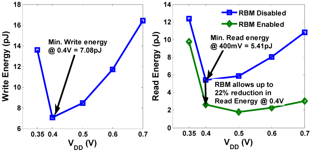 The read and write energies (Figure 9) are minimized at 400 mV to 5.41 pJ/access and 7.08 pJ/access, respectively, assuming equal percentages of “0” and “1” bits within each word. The read burst mode can provide up to 22% reduction in active read energy at 400 mV when enabled. Measurement results show that the charge pump circuits used to boost RWL, WWL and VVSS driver consumes only 3% of the total read/write power at 400 mV.
