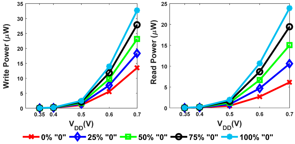 As discussed in Section 2.1.1, the percentage of “0” bits within a word impacts the read power consumption due to the discharging of RBL during a read “0”. Since a read-before-write approach is used to address half-select failures, the percentage of “0” bits will also impact the write power. Figure 10 shows the read and write power for different percentages of “0” bits within a word. Reducing the percentage of “0” bits from 50% to 25% will result in a maximum of ~30% and ~21% reduction in the read and write power at 0.6 V.