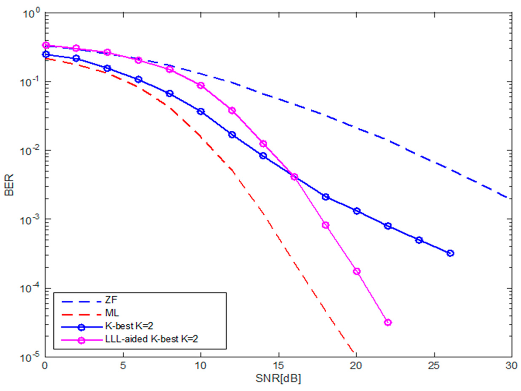 - Zhou, Q.; Ma, X.L. An improved LR-aided K-best algorithm for MIMO detection. In Proceedings of the 2012 International Conference on Wireless Communications & Signal Processing (WCSP), Huangshan, China, 25–27 October 2012; pp. 1–5.