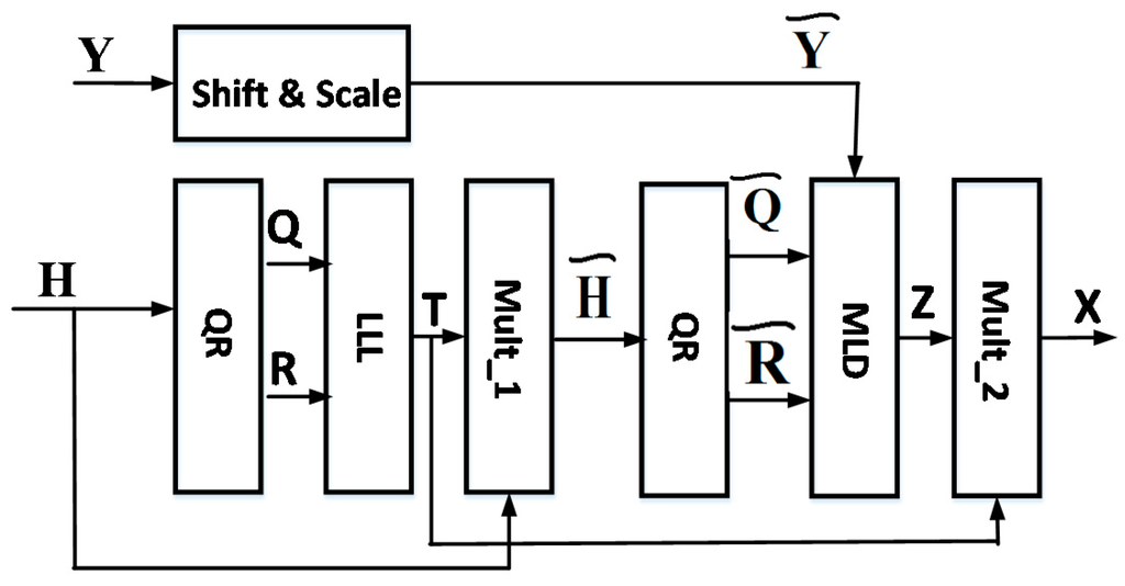 - The functionality of the MLD block is to detect z as described in Section 3, as . To achieve this it needs to perform the search process described in Equation (7) using a breadth-first K-Best algorithm