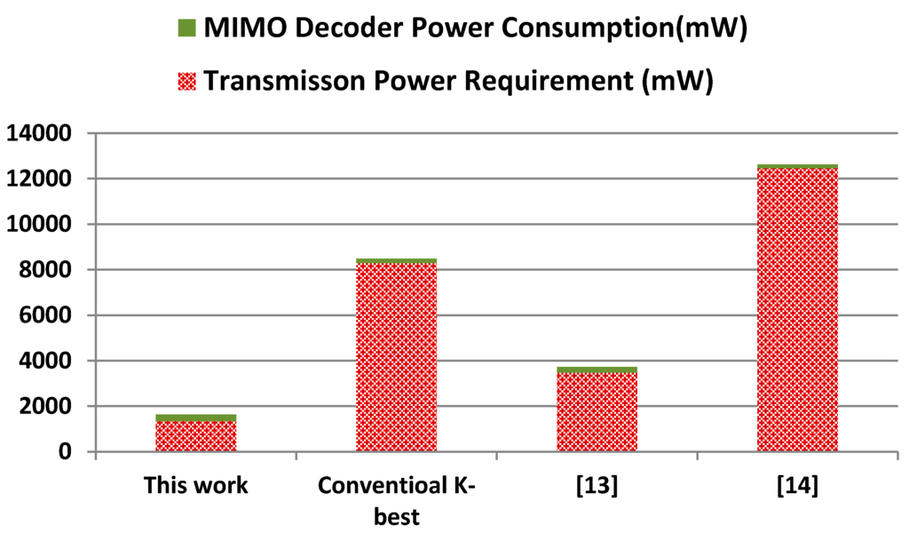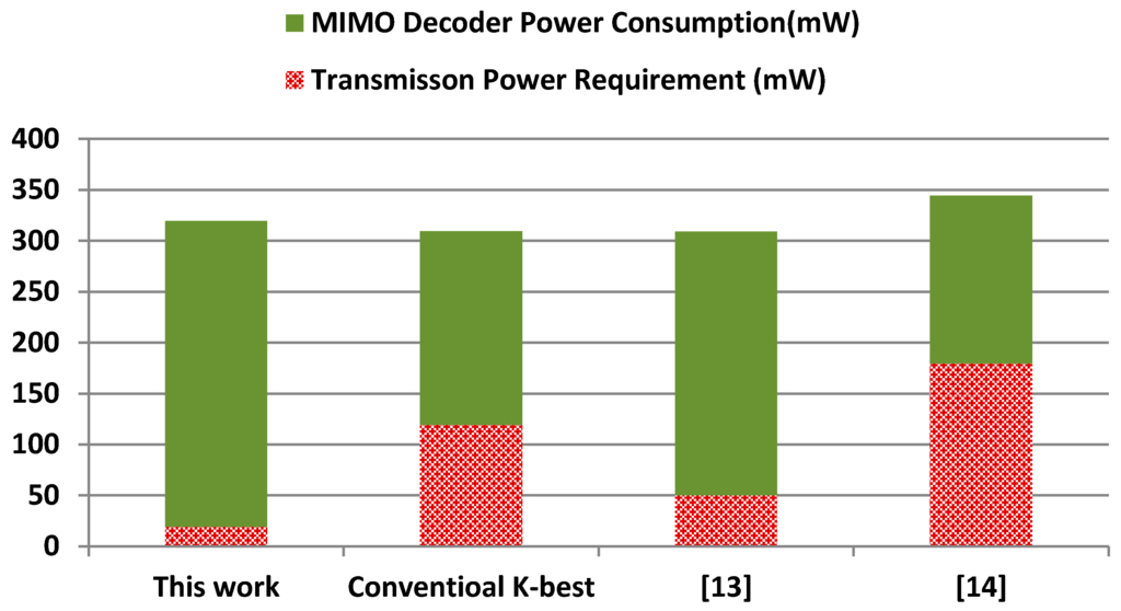 The minimum transmission power requirement is estimated using Equation (9) based on free space communication medium, where we have considered the minimum acceptable BER of 10−3, this is because received signals with BER higher than this figure may not be reliably detected [20]. We have considered two study cases: 4G and 5G wireless communication networks. The operation parameters of 4G systems are obtained from the third-generation partnership project which provide detailed information on the operating conditions of such networks [21], where we consider a 4G network transmission frequency of 1.8 GHz. The operation parameters of 5G networks are still in the development stage; initial estimates of the transmission frequencies indicate they are within the range 10–100 GHz [22]. For the purpose of this work we have considered the first successful implementation of a 5G wireless communication network recently announced by Ericsson [22], where in the transmission frequency was set to 15 GHz. In both of the above cases we consider the average distance between a mobile device and a base station around 200 m [20]. Figure 5 and Figure 6 illustrate the power costs of the proposed design in comparison with conventional K-best decoder and recently published energy efficient MIMO detection schemes. The two components of the power overheads: MIMO decoder power consumption and transmission power are illustrated separately. For completeness we have also included a comparison of the VLSI implementation in Table 1.