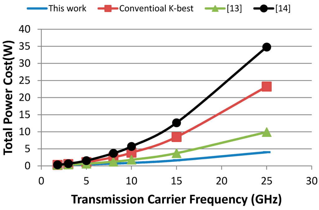 For the first case study, i.e., the 4G wireless mobile network, Figure 5 shows that the proposed MIMO can significantly reduce the transmission power requirements at the expense of increased power consumption of the MIMO decoder; therefore, its overall power costs is comparable to existing approaches. However for the second case study, i.e., the 5G wireless network, our decoder exhibits remarkably higher power efficiency, because it reduces the overall power cost: by two- and seven-fold, compared with conventional K-best implementations in [13,14], respectively. These large power saving are expected to be higher as the carrier frequency increases. Figure 7 show the relationship between the transmission carrier frequency and the overall power consumption costs for the four schemes.