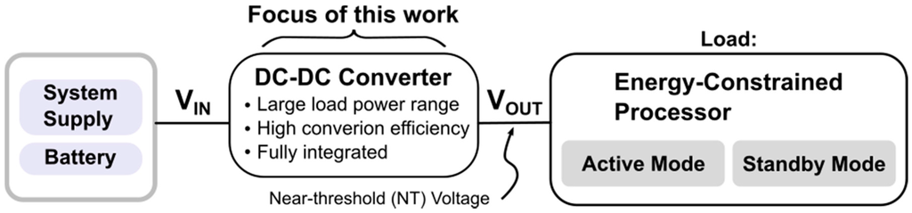 The relevance of energy-constrained processors [,,,,,] in sensor-based platforms for Internet-of-Things (IoT) applications continues to grow. These processors typically operate at near-threshold (NT) voltages since operation at NT significantly reduces energy consumption but avoids the large variance and performance penalties associated with sub-threshold voltages []. While operating at NT, energy-constrained processors utilize multiple active and standby power modes to achieve further energy savings [,,]. The NT voltage must be supplied during each of these power modes to ensure functionality within always-on blocks such as memory, timers, and interrupt controllers [,]. As shown in Figure 1, NT voltages are typically supplied to energy-constrained processors by a DC–DC converter with a system supply or battery. The DC–DC converter is a critical block since the energy consumption of the DC–DC/processor system is proportional to the efficiency of the DC–DC converter. Achieving high efficiency in the DC–DC converter is therefore essential to realize energy savings associated with NT operation of the processor. Maintaining high efficiency over a large load range is also required since toggling between active and standby power modes induces 200× [] to 6000× [] changes in load power.