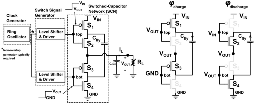 A conventional 2:1 SC DC–DC converter is shown in Figure 2. This converter steps down the input voltage (VIN) through a Switched-Capacitor Network (SCN). During a charge phase (ϕcharge), VIN charges Cfly and delivers charge to the output. A charge phase requires that only S1 and S3 be turned ON. During a discharge phase (ϕdischarge), the charge stored previously on Cfly is discharged to the output. The discharge phase requires that only S2 and S4 to be ON. The Clock Generator and Switch Signal Generator blocks provide signals to the gates of the switches (S1–S4) that ensure the correct charge or discharge phase configuration. The self-oscillating converter, which is explained in the subsequent paragraph, has an SCN that operates in the same manner as the conventional converter, but it does not require the Clock Generator and Switch Signal Generator blocks. Eliminating the need for clock generation and level conversion overhead is advantageous for low power systems since they are the dominant power losses at sub-5 μW loads [,].