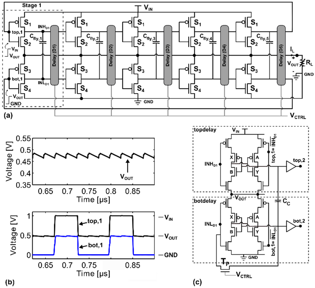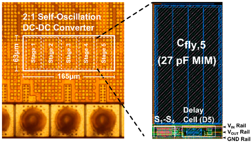 The 2:1 self-oscillating DC–DC converter is shown in Figure 3a. It is comprised of two stacked ring oscillators. The oscillators are synchronized through the fly capacitors (Cfly,1–5) and coupling capacitors Cc within the delay cell. The delay cell determines the oscillation frequency of the stacked ring oscillators. Modulating the oscillation frequency is used to maintain the output voltage over changes in load power.