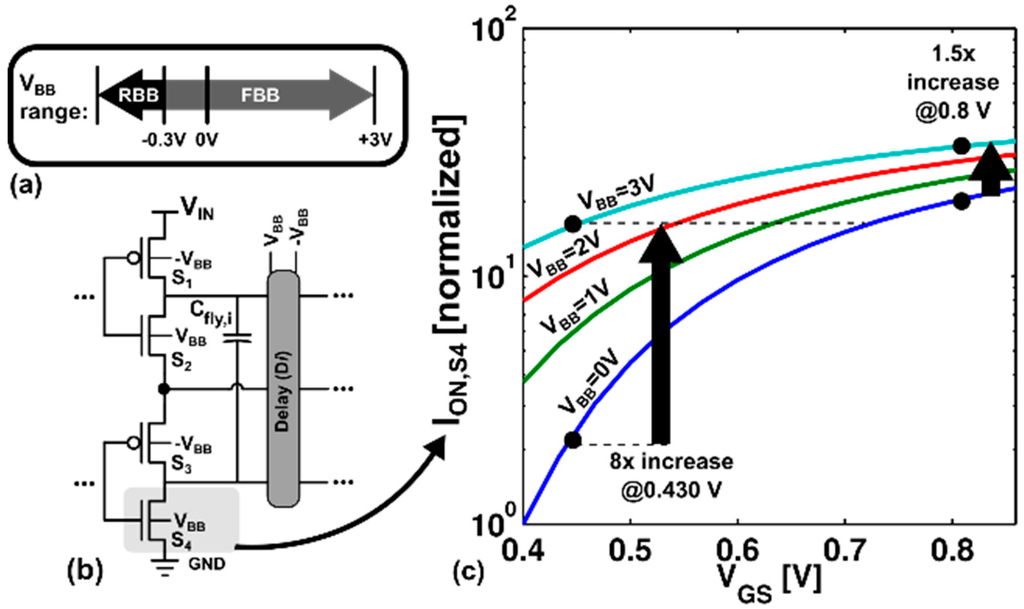 where m is the number of switches in one stage of the converter, k is the total number of stages within the converter, Li and Wi are the charge-transfer switch sizes, Ki is the technology constant, and VGSi is the gate-source voltage of the charge-transfer switch. From Equation (2), it can be seen that decreasing the threshold voltage (Vth,i) through increased VBB results in a larger overdrive voltage, and thus, a larger Gtot. Using the back-gate biasing configuration from Figure 4, Equation (2) expands to