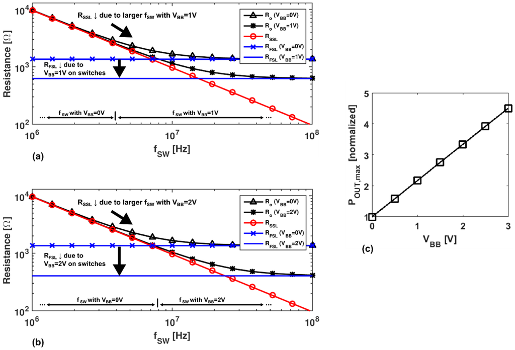 The overall impact of back-gate biasing on the converter is found by examining the converter’s total output impedance (RO). The total output impedance depends on contributions from both the slow-switching regime impedance (RSSL) and the fast switching impedance (RFSL) as in []: