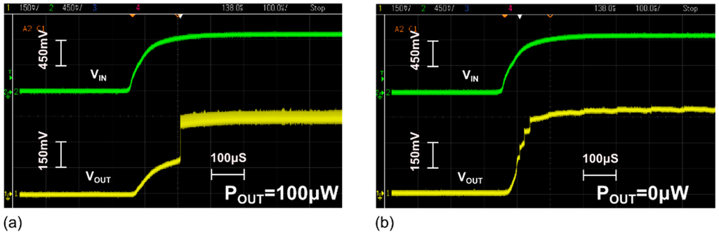 Due to the stacked ring oscillators, the self-oscillating converter is able to start-up without any auxiliary start-up control circuitry. Removing this control circuitry is especially beneficial in terms of efficiency at nW load powers (e.g., standby mode). A measurement of the converter at start-up is shown in Figure 7. An input voltage (VIN) is stepped from 0 V to 1 V using the maximum slew-rate of an off-chip voltage source. For both output power levels (POUT = 0 µW and POUT = 100 µW), the converter stabilizes at approximately the same time that VIN reaches 1 V. At POUT = 0 µW, the power consumption of the DC–DC converter is 15.6 nW.