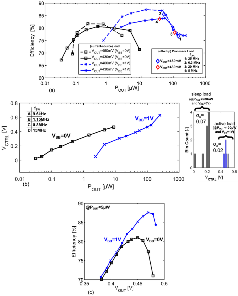 The converter’s efficiency versus the output load power (POUT) is shown in Figure 8a. The efficiency is measured at two near-threshold output voltages (VOUT = 430 mV and VOUT = 460 mV). The converter’s load power range is extended significantly by applying a back-gate bias of VBB = 1 V (i.e., PMOS back-gate biased with −1 V and NMOS with 1 V). The 1 V is generated from VIN, while the −1 V is from an off-chip voltage source. Negative body bias generators can produce −1 V with nW power consumption [], and thus, have minimal impact on efficiency at µW load power. At VOUT = 460 mV, and using VBB = 1 V, the converter achieves a minimum efficiency of 75% for 79 nW to 200 µW (current source). With an off-chip 32-bit processor load, the converter’s efficiency closely matches the efficiency of the (current source) test load. With the processor load at fCPU = 6 MHz, the converter operates with a peak efficiency of 86%. The processor’s load power is adjusted by changing the operation frequency of the processor load (fCPU) over a range of 5 MHz to 25 MHz.