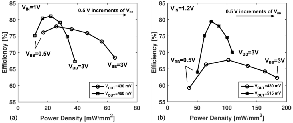 Measurement results of efficiency vs. power density for increasing back-gate bias voltages at (a) VIN = 1 V and (b) VIN = 1.2 V.