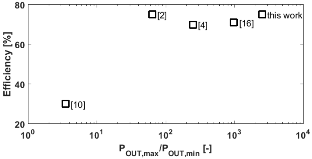 Comparison to state-of-the-art in terms of efficiency and load range (POUTmax/POUTmin).
