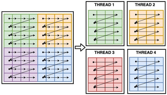 In the process of ME algorithm parallelization, we design a multi-core computing model to exploit the data parallelism properties inherent in the ME algorithm. In the algorithm, there is no data dependency between two macro-blocks’ SAD. Thus, the SADs of different macro-blocks can be computed in parallel. Considering this, we divide Cur into the same number of subsections as there are threads and assign each subsection to a particular thread. Eventually, all of the threads run in parallel across multiple cores to execute the SAD processing. The benefit of this division into subsections is to make full use of the available cores on the underlying platforms. Figure 1 illustrates a four-threaded computation model for an 8 × 8 frame.
