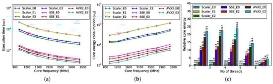 It is also interesting to note that the multithreaded parallelization of the motion estimation kernel does not lead to core-energy savings despite the reduction in execution time due to parallelization at a peak core frequency on the Haswell system. This is an expected behavior if proper power saving mechanisms are in place, meaning that idle cores go into low power mode and do not contribute significantly to the total energy consumed during the application run. This is illustrated in Figure 3c. In contrast, vectorization results in quite a significant amount of core energy savings for the motion estimation kernel. This is due to several reasons. First, Intel processors do not have a separate vector unit or separate vector registers. This translates into a small increase in the power dissipated by the ALUs/register bank working with SIMD instructions instead of scalar. In fact, GCC/ICC compilers no longer generate the scalar assembly, but rather SIMD instructions working only with the lowest vector lane. In addition, when working with vectors, the system spends more idle waiting time for memory, and therefore, cores can go into low power mode more often. This demonstrates that vectorization can lead to significant core energy savings if they can be applied effectively.