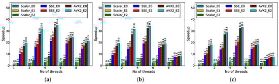 Figure 4 and Table 4 present the multithreaded performance of different kernel implementations at different core frequencies. From the figure, we can observe that the performance of all of the kernels increases with the increasing number of threads as long as only one thread runs on a given physical-core. AVX2_E2 provides the best performance in all cases and can provide speedup up to 34× on the Haswell system over the unoptimized scalar kernel (SSE_E0) when four threads are used. However, beyond four threads, when hyper-threading is used, the performance is degraded. This performance is less than what we could potentially achieve with the combination of multithreading (≈4×), vectorization (≈16× using SSE and ≈32× using AVX2 for an 8-bit value) and data reuse transformations.