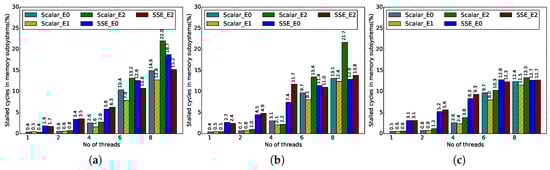 Percentage of stalled CPU cycles on the memory subsystem for multithreaded ME-kernel implementations at different core frequencies on the Haswell system. (a) Stalled cycle at 800 MHz; (b) stalled cycle at 2500 MHz; (c) stalled cycle at 3500 MHz.
