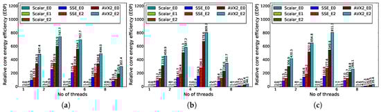 Relative EDP of multithreaded ME-kernel implementations at different core frequencies on the Haswell system. A higher relative EDP value indicates better energy efficiency. (a) Relative EDP at 800 MHz; (b) relative EDP at 2500 MHz; (c) relative EDP at 3500 MHz.