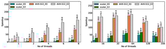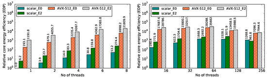 In our last set of experiments, we study the same problem in the many-core context. To this end, the best performing transformation options (E2 kernels) are chosen along with the baseline (E0) to carry out scalability tests on the Intel Xeop Phi Co-processor (KNL). However, unlike the experiments done on the multi-core platforms, experiments on the KNL platform deal with full HD frames (1920 × 1080) as an input rather than the QCIF format. Figure 8 and Figure 9 present improvements for the speedup and energy efficiency metrics that can be achieved through the optimized kernels when run on up to 256 threads on KNL (64 cores running four threads each; the rest of the cores are reserved to manage the operating system). In Figure 8, observations on the single core performance highlight two interesting aspects of the kernels being investigated. First, Scalar_E0 (i.e., unoptimized) and Scalar_E2 (i.e., optimized using data reuse transformations) kernels exhibit ≈3× performance increase, which is similar to what was observed on the Haswell system. Therefore, we can conclude that the data reuse transformations on a single core in a KNL coprocessor are as effective as the transformations on a single core in the Haswell system. Second, once again, the performance difference between a non-vectorized and vectorized kernel is quite significant; for example, the single-threaded AVX512_E2) kernel is ≈35× faster than the single-threaded (Scalar_E0) kernel on the Haswell system (Figure 4c). Third, a significant amount of performance improvement can be observed by the deployment of data reuse transformations in conjunction with the AVX512 vectorization technique. Particularly for lower number of threads (i.e., <8), AVX512_E2 provides ≈2× better performance than AVX512_E0. Furthermore, we can also observe that the performance is increased with the increasing number of threads until it passes 64 threads and simultaneous multithreading takes place.