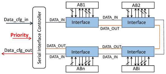 The proposed asynchronous service network (ASN) is shown in Figure 1, and is composed of two main blocks: a serial interface controller (SIC) and the interfaces that are directly connected to the adaptive blocks (ABs). The serial interface controller (described in Section 4.3) receives the configuration data from a microcontroller (which is not shown), and passes them to the interfaces described in Section 4.2. The communication protocol is serial, and the interfaces are connected in a daisy chain topology to reduce the number of metal wires needed and have the least intrusive deployment of the network.