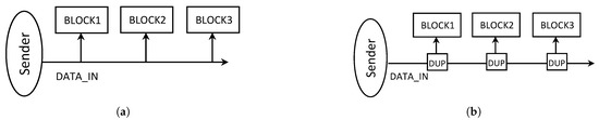 The bus topology represents a good latency/complexity trade-off, and is already used for many networks. However, an asynchronous channel can only be read by one block at a time. To send asynchronous data through a bus to several blocks, the data needs to be duplicated (Figure 2) as many times as there are blocks to ensure a correct handshake protocol. Thus, we chose to implement a daisy chain topology as a better solution. Only one asynchronous channel will run through all interfaces, so the wire count will be diminished significantly. In a bus topology and for a four-block network, there will be 65% more wires than in a daisy chain topology. Moreover, when using a daisy chain topology, if an interface is busy and cannot accept the new configuration data (because the previous ones were not processed yet), the data will only have to continue through the network until it reaches the SIC and be sent again.