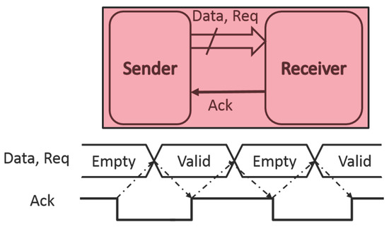 Asynchronous design is a design methodology for digital circuits where no clock is used. Instead, a handshaking protocol is used to signify when it is correct to process data. When the sender is ready to send data to the next block (the receiver), a request signal (Req) is sent to the receiver, which in turn sends an acknowledgement (Ack) to the sender to signify that it is ready to receive the data (Figure 3). Once the data is sent, a new acknowledgement signals that the data was correctly received. Unless the Ack is sent, the sender cannot receive any data from any other block. This blocking communication scheme ensures that the data in the sender is not lost or replaced, and that the appropriate data has been sent correctly.