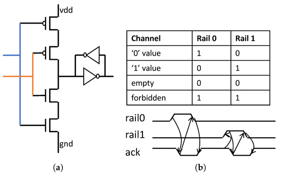 In this design, we are using a four-phase dual rail protocol, where the data request is encoded within the data (i.e., each wire is duplicated to carry the request with it—Figure 4b). For instance, when we send a bit “0” through the channel, only rail0 is activated. Once the data has been received, the Ack signal goes to zero, and waits for the rail0 signal to go back to zero to have the empty value (when both rail0 and rail1 are at “0”). Once the Ack signal is active again, we can send new valid data. This protocol is possible thanks to the Muller gate (also called C-gate), which manages the acknowledgement (Figure 4a) [24]. This gate switches when both inputs are coincident, therefore acting as a Rendez-vous for the inputs. In an asynchronous circuit, it allows synchronization of the events and ensures the correct acknowledgement.