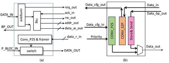 Similar to the interface, the SIC is asynchronous (Figure 5b). The SIC has two main roles: the first is to process the configuration data (either the data sent to the adaptive blocks or received from the adaptive block) and the bypassed data, and the second is to handle the priority data. The SIC is composed of three blocks. The first is a parallel-to-serial converter (CONV_P2S) which receives the parallel data from the microcontroller, adds the bypass bit to the frame, then sends it to the network serially. The second block is the serial-to-parallel converter (CONV_S2P) which receives serial data from the network (the result of a read operation), converts it to parallel data, and sends it to the microcontroller. The third block is the Store&Send block, which receives the bypassed serial data from the network and sends it back to the network. The SIC has three input channels: two to receive data from the interface (one for the read data and the other for the bypassed data) and one for the frame coming from the microcontroller. The parallel data received from the microcontroller simply replicates the frame structures without the bypass bit, which is added by the SIC. The two types of frames it receives from the interfaces are the bypassed data and the sense data sent after a read operation of the adaptive blocks. The first type of frame is stored to be sent back to the network, and the second frame is sent to the microcontroller after converting it to parallel data. Upon receiving the bypassed data, the SIC checks if any data is being sent to the network. If that is the case, the SIC waits for the data to be sent, then sends the bypassed data; if not, then the bypassed data is sent without delay. The same is true for the regular configuration data. Once the SIC receives configuration data from the microcontroller, it checks an internal priority flag first (set by the PRIORITY input). If the priority bit of the frame is at “1”, it sends the data through the network; if not, the data is disregarded, and the SIC waits until the correct high priority frame arrives to send it through the network, after which, the priority flag is reset. When the priority flag is at “0”, the SIC simply sends the data to the network.