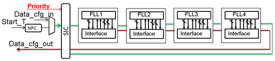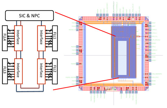 The latency, throughput, and power consumption were calculated post back-end with sdf back-annotation. Furthermore, to be as representative as possible, each interface was positioned a distance away from the next one (Figure 9) to simulate a realistic communication implementation. The UTBB FDSOI 28 nm technology was chosen, as it corresponds to today’s ultra-low-power platform [25], and the simulations were conducted at 0.6 V. The proposed network and FLL’s configuration scheme are represented in Figure 8. The chosen frame contains 47 bits, as shown in Table 3.