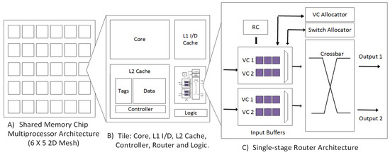 - Muhammad, S.T.; El-Moursy, M.A.; El-Moursy, A.A.; Refaat, A.M. Optimization for traffic-based virtual channel activation low-power NoC. In Proceedings of the International Conference on Energy Aware Computing Systems Applications (ICEAC), Toledo, Spain, 22–28 July 2015; pp. 1–4. [Google Scholar]