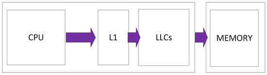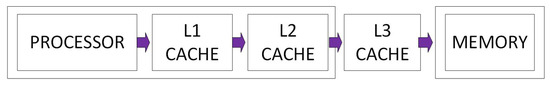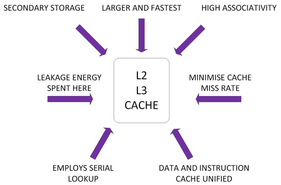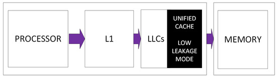 The tag-bloom techniques use tags to directly map addresses in L1 and L2 caches [3,41,42]. The bloom filter algorithm is then used to predict the cache misses and divert the search to the main memory rather than to waste time and energy in searching the cache. Some techniques use the pre-fetching technique and cache locking to save dynamic power. The pre-fetching and locking techniques save power by reducing the penalty cost of cache misses. Some techniques aim to reduce the number of active ways accessed in each cache access to the number of ways halted in the case of a miss prediction using software or hardware. Other techniques reconfigure cache using computer software [43], while some techniques predict the program behaviour [3,41,42,44,45,46]. Some techniques deal with instructions in the cache [3,15,16,41,47,48,49,50,51,52]. Some techniques seek to leverage unused cache block words in order to reduce dynamic power consumption [18,36,53]. These techniques flush out the unused words from the cache and keep the cache current. Some techniques introduce a new level of cache called L0. L0 is placed between the processor and the L1 cache in order to improve the speed at which it can be accessed [44,54]. Some techniques use a near caching concept (Figure 9). The SRAM is placed closer to the memory rather than closer to the processor. This allows quick access of larger blocks from memory.