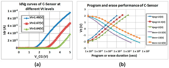 The important characteristic of the radiation sensor is its coupling ratio (CR)—the relation between the control capacitor (STI) and read-out capacitor (GOX) values. A high coupling ratio (above 10) ensures high gm of the read-out NMOS (close to that of standard NMOS) and allows to minimize the injection voltages (the applied voltages falls on the GOX between the FG and the substrate). The layout of one of the developed sensor with minimum Design Rule (DR) NMOS and CR = 10 is shown in Figure 1e. Id-Vg characteristics for different amount of charge in FG (readout mode) are presented in Figure 2a. The charging/discharging curves of the sensor are shown in Figure 2b.