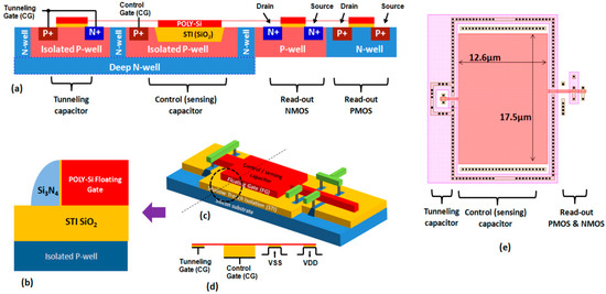 Advanced version of C-Sensor cell, utilized in practical systems design: (a) schematic cross-section; (b) dielectrics surrounding FG; (c) schematic 3D view; (d) principal electrical scheme; (e) layout (some layers are omitted).
