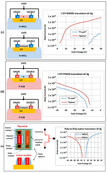 The second two types of structures are PMOS transistors with Polysilicon gate and P-well drain and source: one with N-well substrate and another with the native substrate (Figure 6b). The N-well substrate is implemented using N-well and deep N-well implants of a standard CMOS process. Id-Vg curves show threshold voltages of about −40 V and −5 V for N-well and native transistors, correspondingly.