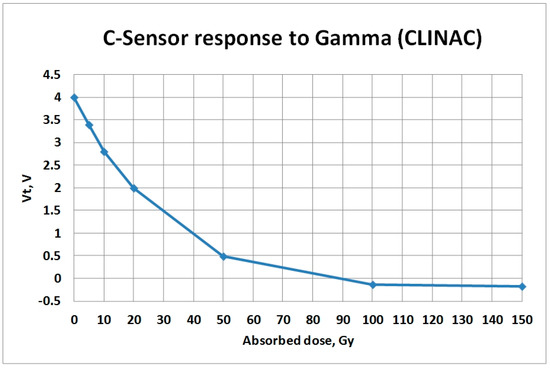 Typical discharge kinetics of the C-Sensor exposed to Gamma rays is presented in Figure 7. The C-Sensor was pre-charged to Vt = 4 V and exposed to the radiation beam from a medical linear accelerator CLINAC 700C (Varian). The minimal and peak energy of photons are 2 MeV and 5 MeV respectively. The Vt of sensor was measured after exposure to different absorbed doses (5 Gy, 10 Gy, 20 Gy, 50 Gy, 100 Gy and 150 Gy).