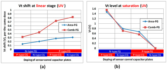 The response of sensors to UV is summarized in Figure 8a (“linear” stage of discharge, Vt shift for the same exposure time) and in Figure 8b (Vt level at “saturation” stage of discharge).