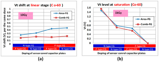 As seen from Figure 7, at the beginning of discharge the Vt loss is nearly linear. In this mode the sensor is supposed to operate in the products. For doses above 100 Gy, Vt of sensor saturates. In this research, we investigated the behavior of different sensors flavors (different geometries and doping of the FG and CG plates) in “linear” and “saturation” stages of FG discharge (the parentheses with “linear” and “saturation” are used to avoid confusion with linear and saturation modes of MOS transistor operation).