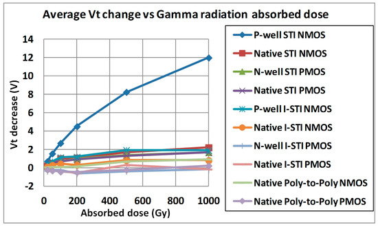 In order to study the built-up of charge in dielectrics, the test structures described in Section 2.2 above were exposed to different doses of Gamma radiation (Co-60 source, dose rate 0.85 Gy/h) in a passive mode. Id-Vg curves were measured before and after the exposure. To account for the spread of the measured Vt change (before and after irradiation) for each test case, average values of Vt change were calculated. The analysis of the obtained results is summarized in Figure 11.
