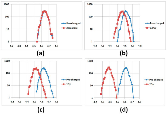 Another group of sensors was pre-charged to the same level of 3 V and exposed to doses of 10 Gy and 20 Gy (“linear” response) and 500 Gy and 1000 Gy (“saturation”). The response of sensors in “linear“ (Figure 9a) and “saturation” (Figure 6b) stages of discharge are analyzed similar as in the case of UV irradiation: for “linear” stage, the Vt loss is compared, for “saturation” stage, the final Vt levels are compared.