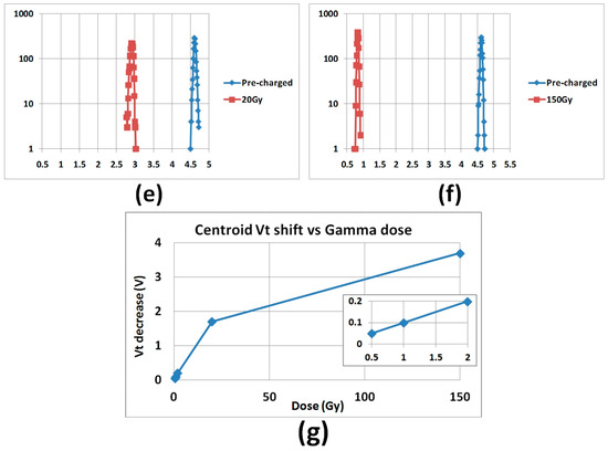 2k arrays response to Gamma (CLINAC): (a–f) Vt distributions; (g) distributions centroid summary (inset—zoom to small doses). The reference array (“zero dose”) was not exposed to radiation.