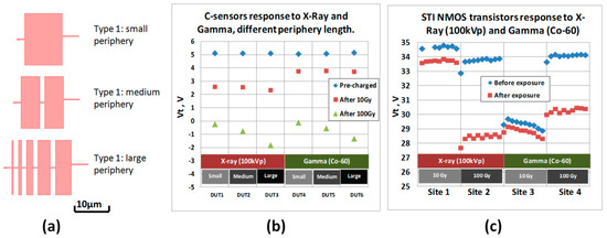 C-Sensors of three FG geometry types were utilized (Figure 13a). All types of sensors have sensing capacitor of the same area, but different periphery length: type 1—~60 µm, type 2—~95 µm, type 3—~200 µm. All sensors were charged to Vt = ~5 V. Then, sensors were exposed to doses of 10 Gy and 100 Gy. The doses were chosen to investigate sensors response in “linear” and “saturation” stages of discharge. After the irradiations, Vt of all sensors was measured. The results are summarized in Figure 13b.